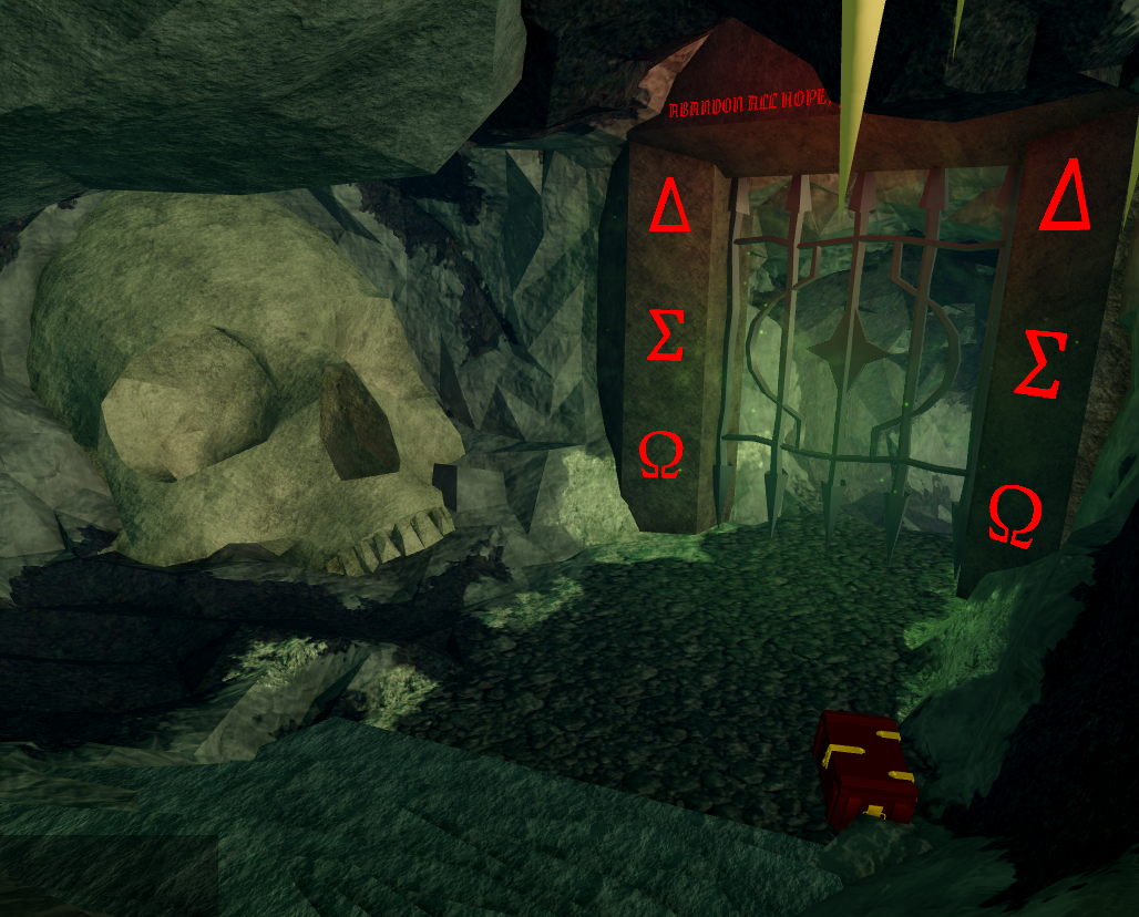 Where the flames of hell burn bright, a gate stands to guard what's in sight, the treasure waits for you to see, so hurry! |